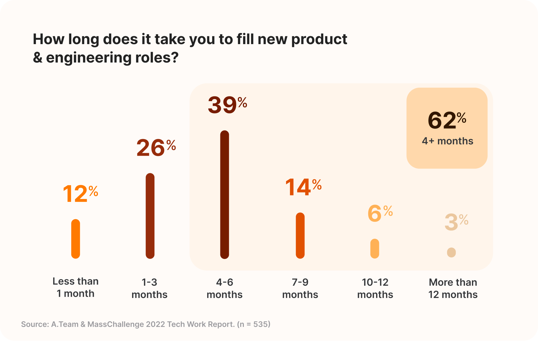 This is particularly true when it comes to product and engineering talent. Sixty-two percent of tech founders & execs say it takes 4 months or more to fill new product and engineering roles, on average.
